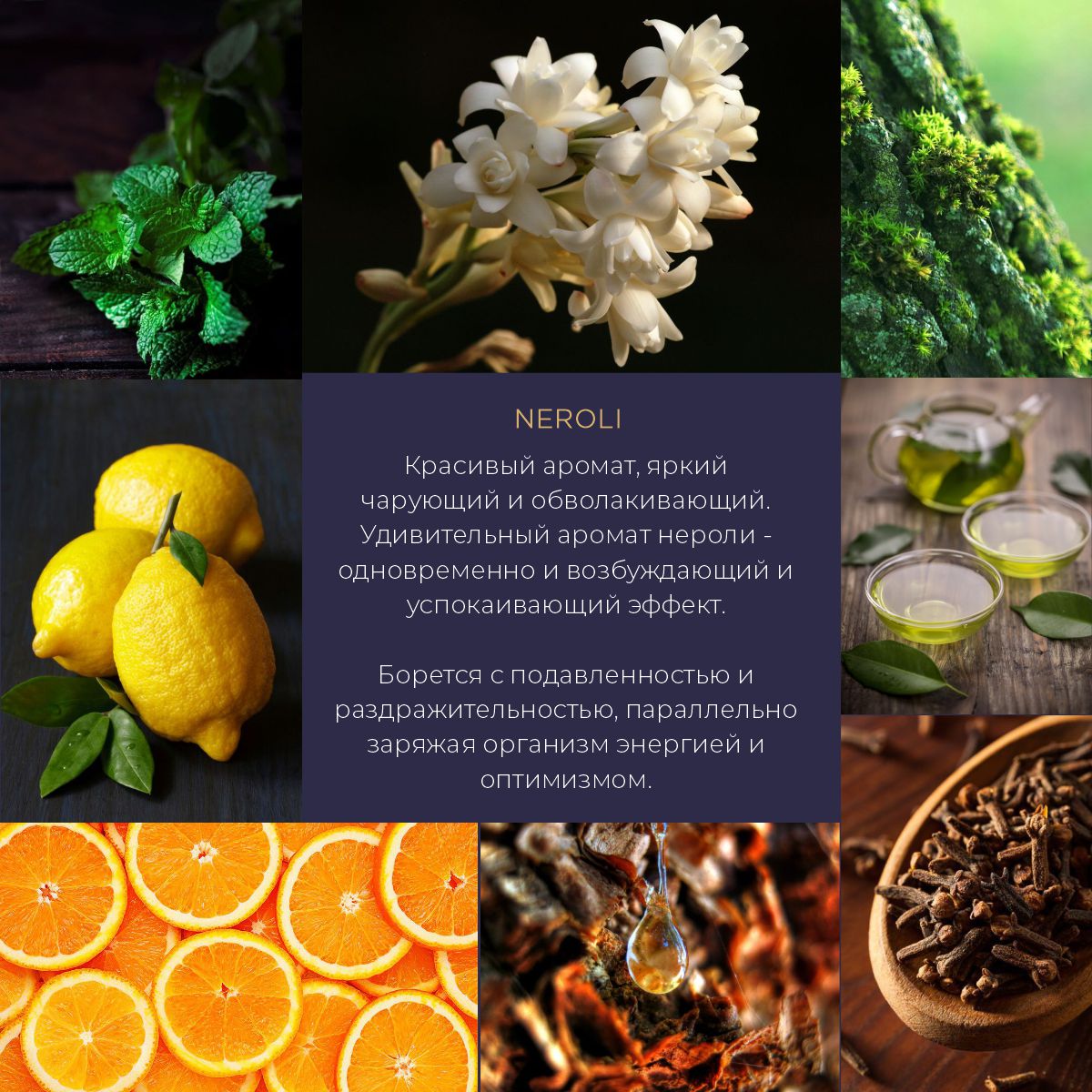 «Neroli» (Нероли) Аромат - Красивый аромат, яркий чарующий и обволакивающий. Удивительный аромат нероли - одновременно и возбуждающий и успокаивающий эффект. Борется с подавленностью и раздражительностью, параллельно заряжая организм энергией и оптимизмом.