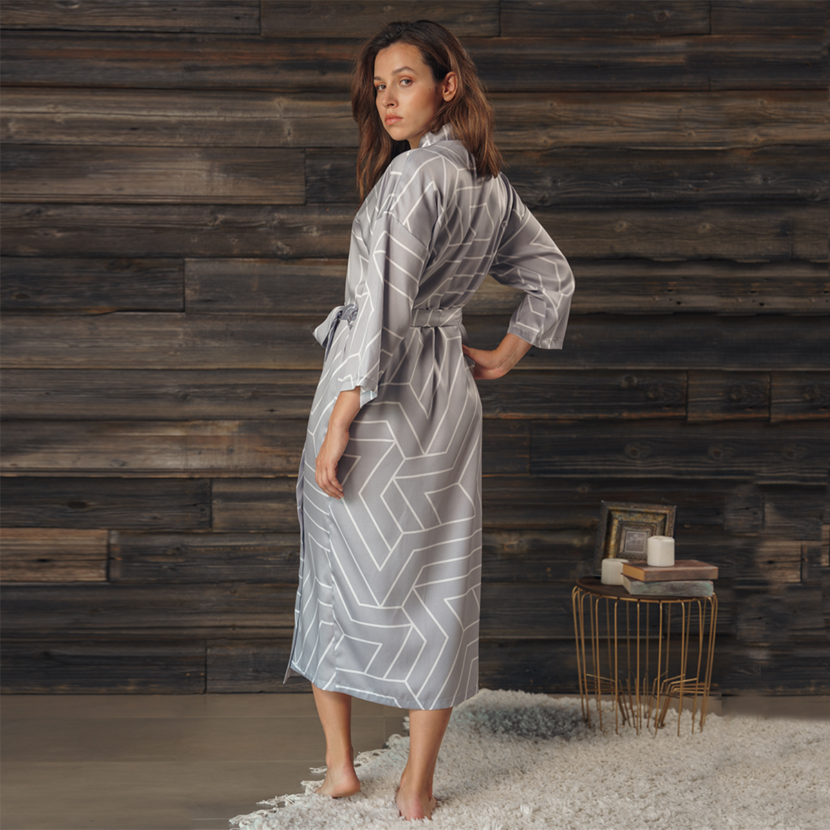 Модель: халат-кимоно, завязывается поясом на запах, имеет внутренние завязки и карманы в швах