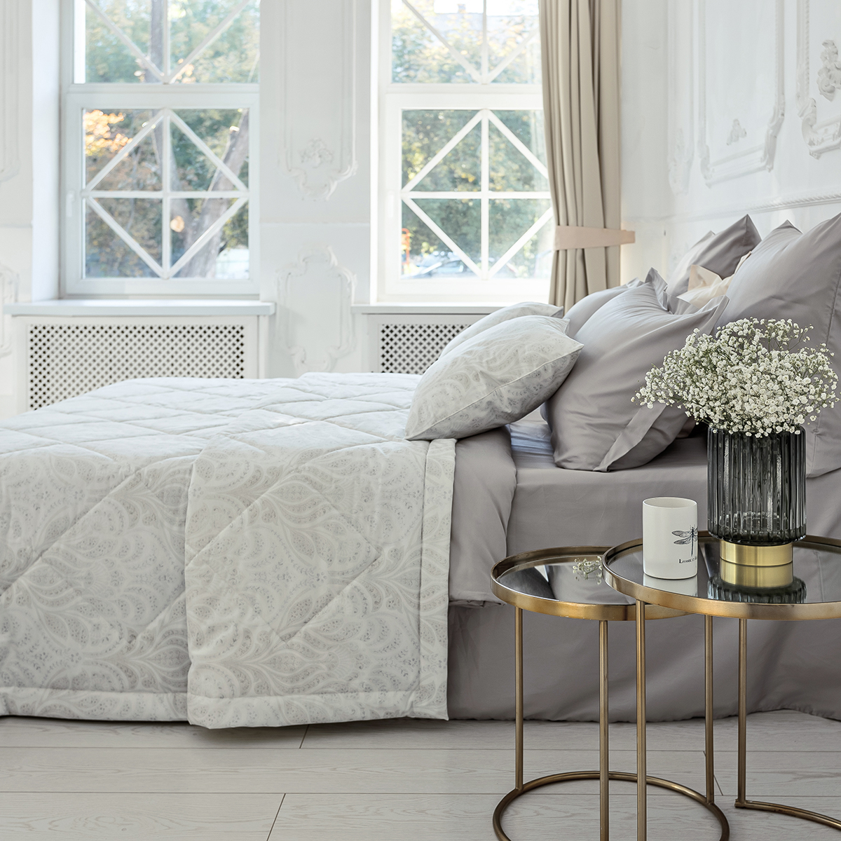 «Франческа» - покрывало с утонченным узором станет отличным выбором для любителей сдержанной элегантности. Легкие линии и деликатные формы, выполненные в пастельных оттенках серого и белого, создают атмосферу уюта и спокойствия. Нежный орнамент, словно сотканный из тончайших нитей, напоминает легкое дыхание природы, придавая интерьеру утонченность и гармонию.