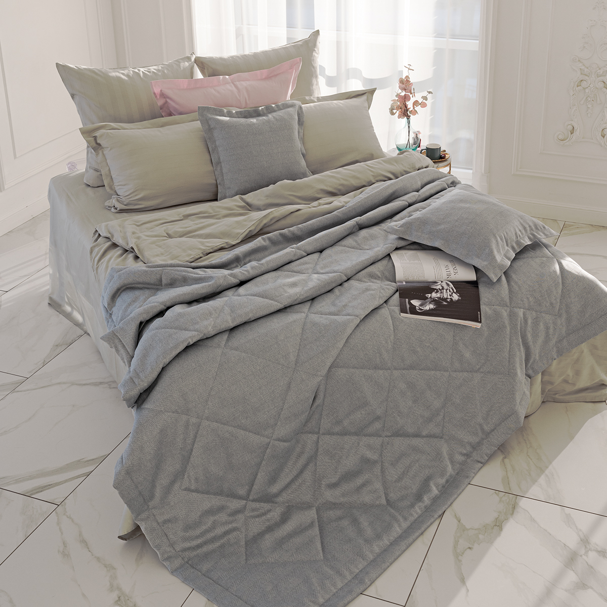 В комплект входит: покрывало стеганое на подкладе размер 240х260 см. Наволочки с ушками на молнии 45х45см – 2 шт.