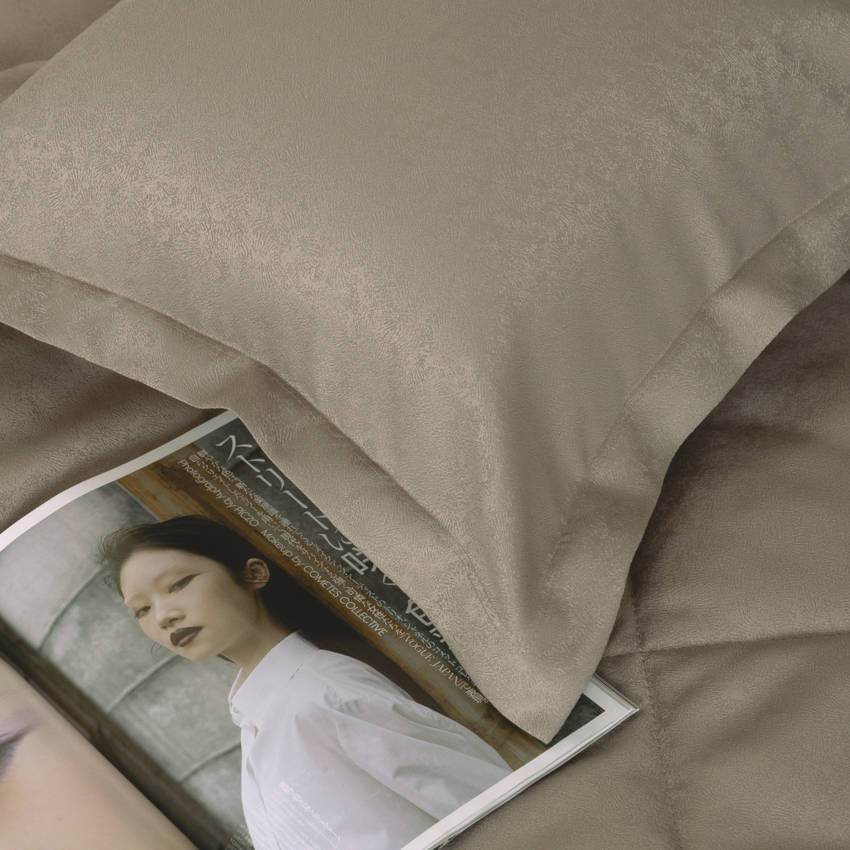 • Деликатная рельефность жаккарда создает изысканную игру света и тени, оживляя поверхность и наполняя её тактильным удовольствием.