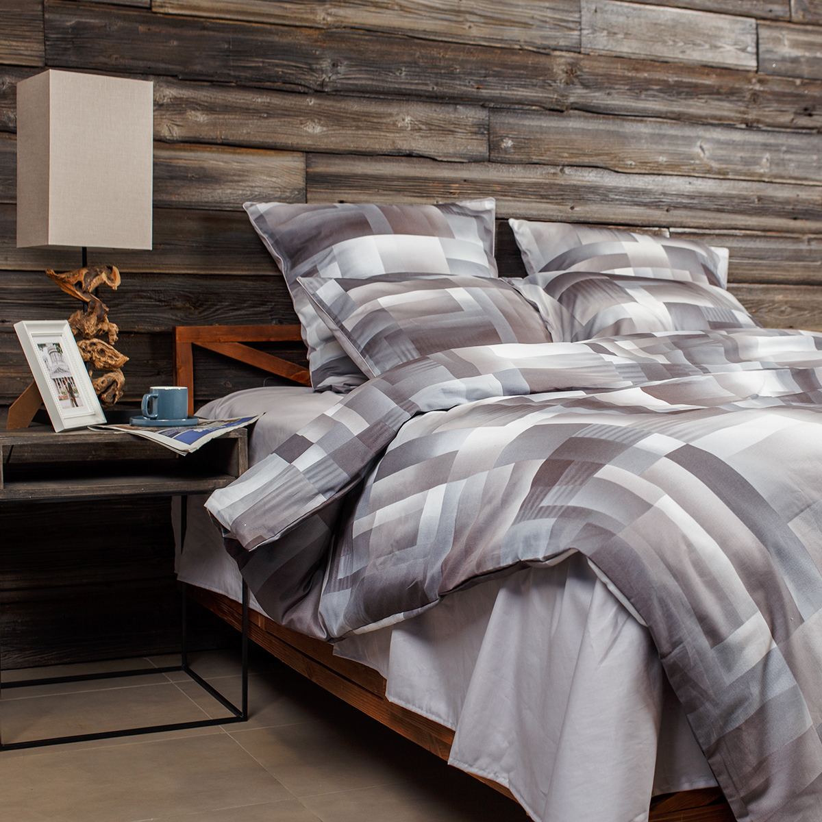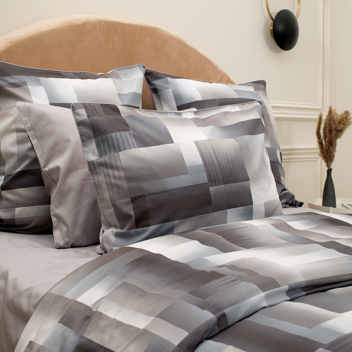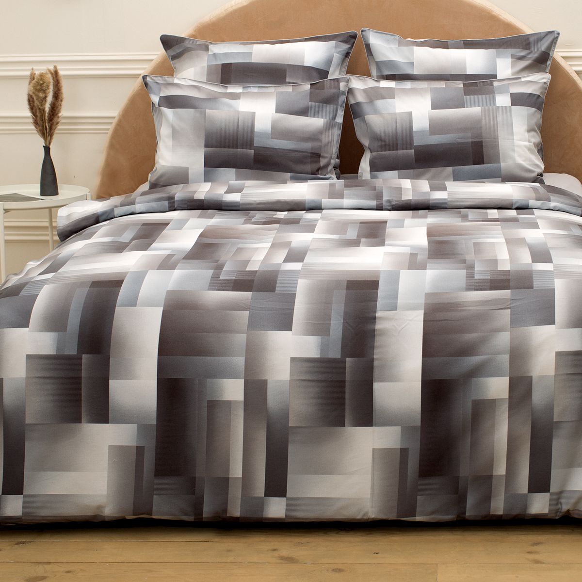 • Наволочки двухсторонние: лицевая сторонагеометрический принт, оборотная – однотонная. Декоративный кант по трем сторонам наволочки. Широкий запах на наволочках - легко менять подушки.