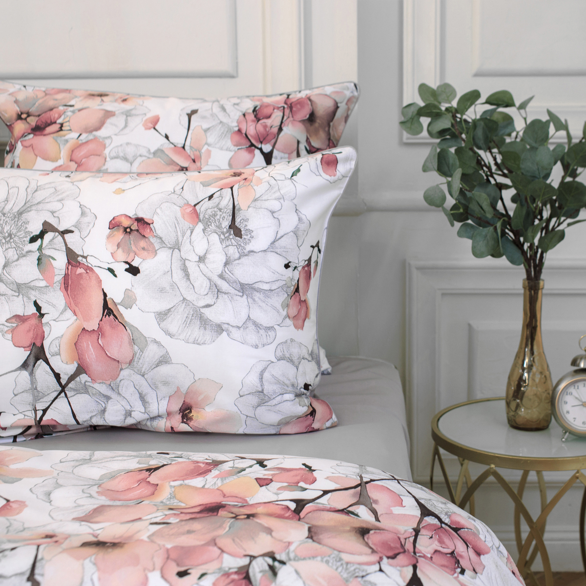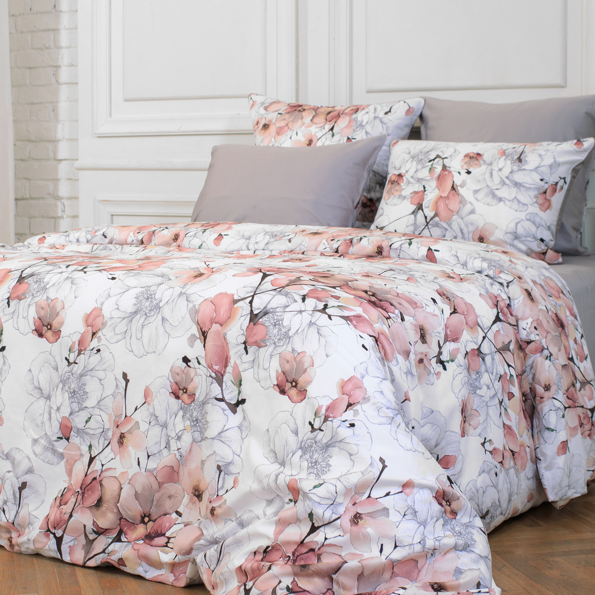 - Наволочки двухсторонние: лицевая сторона – цветочный принт, оборотная – однотонная. Декоративный кант по трем сторонам наволочки.