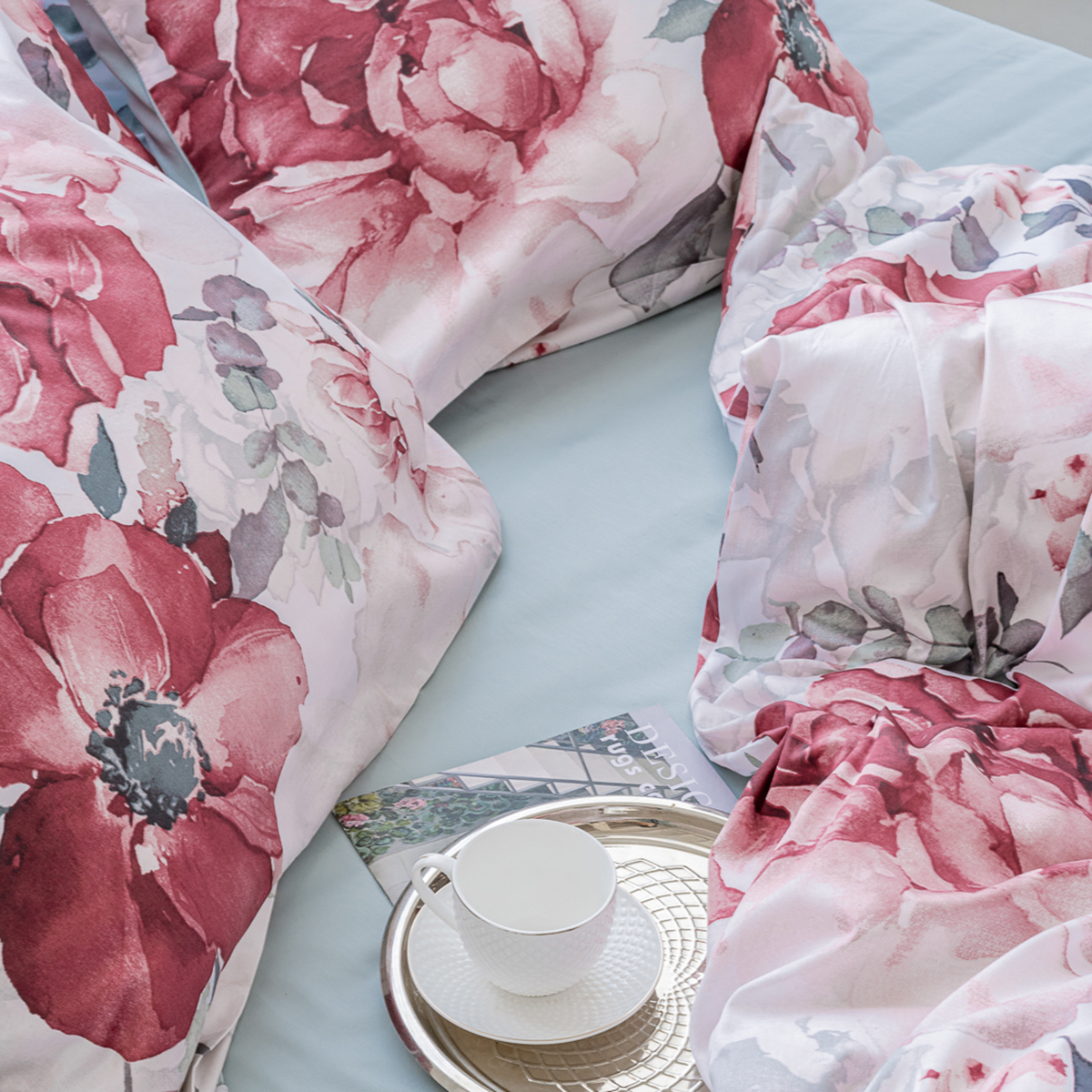 Эффектный акварельный принт, созданных искусным художником. Яркая и сочная красота крупных бутонов чарует и манит… Изящество и нежную красоту роскошного дизайна подчеркивает нежный белоснежный фон комплекта.