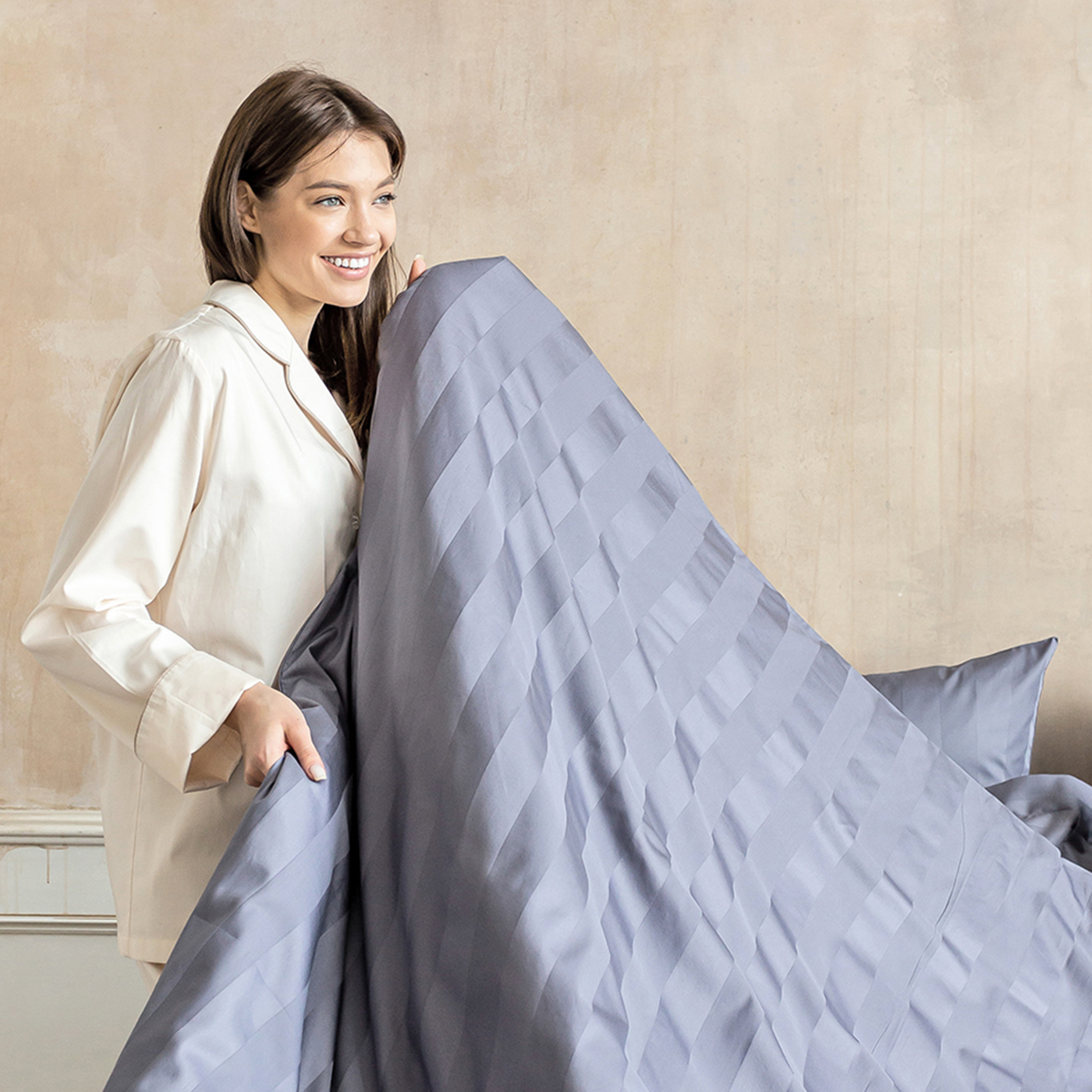 Однотонный комплект постельного белья - роскошный 100% египетский хлопок высшего сорта, с жаккардовым рисунком в виде полос 5х5см. Используется более тонкая 60-я нить. За счет специальной скрутки нити, ткань получается очень мягкая и приятная на ощупь. Имеет благородный блеск.