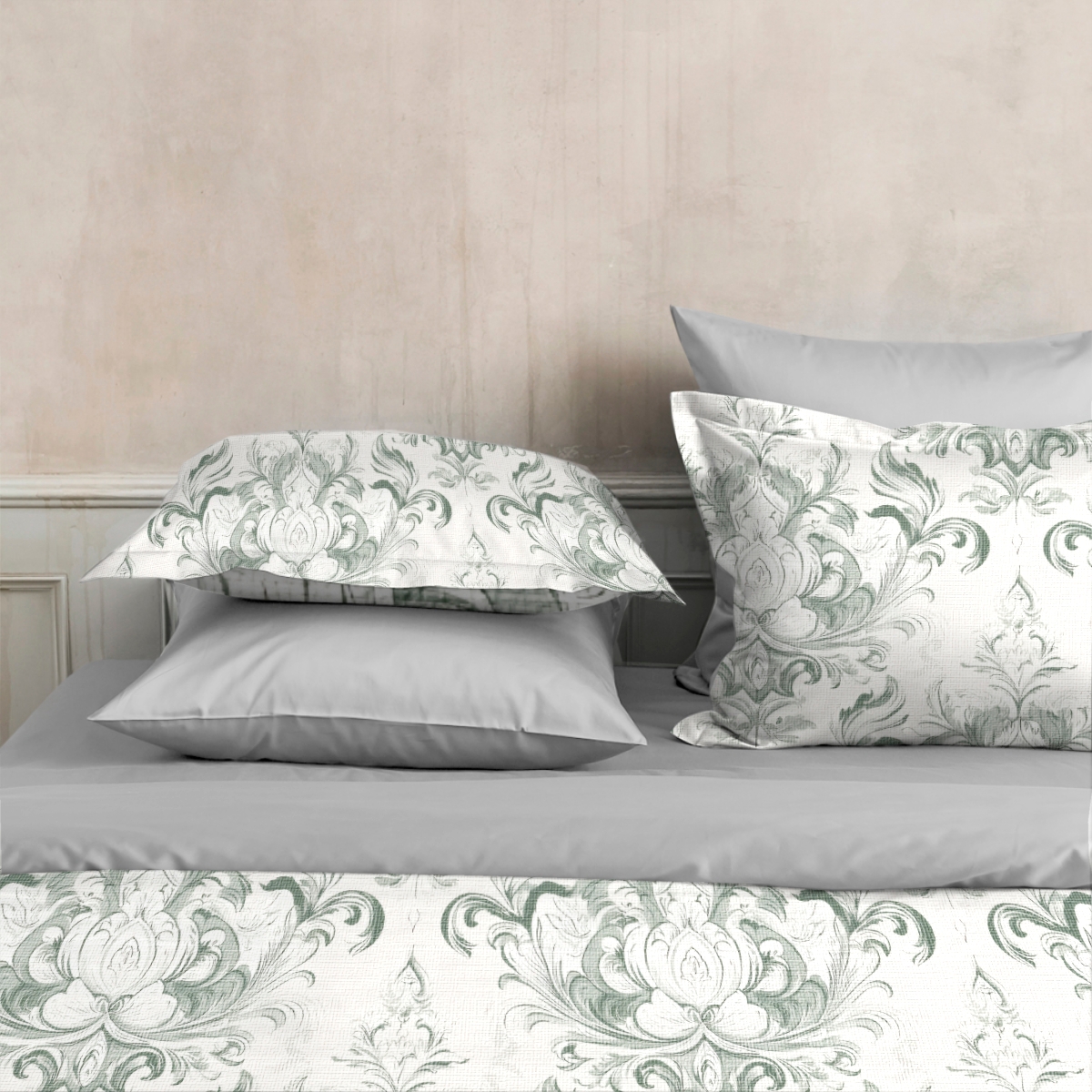 БьянкаПредставьте себе старинную гравюру, где каждый лист, каждый завиток выведен с королевской точностью. «Бьянка» — это барочный сад, застывший на ткани. Изумрудные и фисташковые тона переплетаются в сложном танце вензелей, создавая ощущение вечной роскоши.