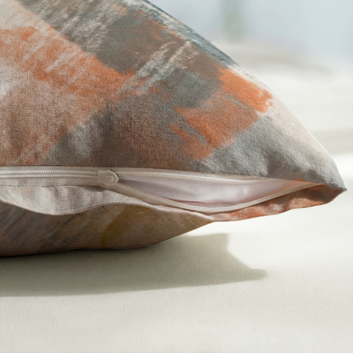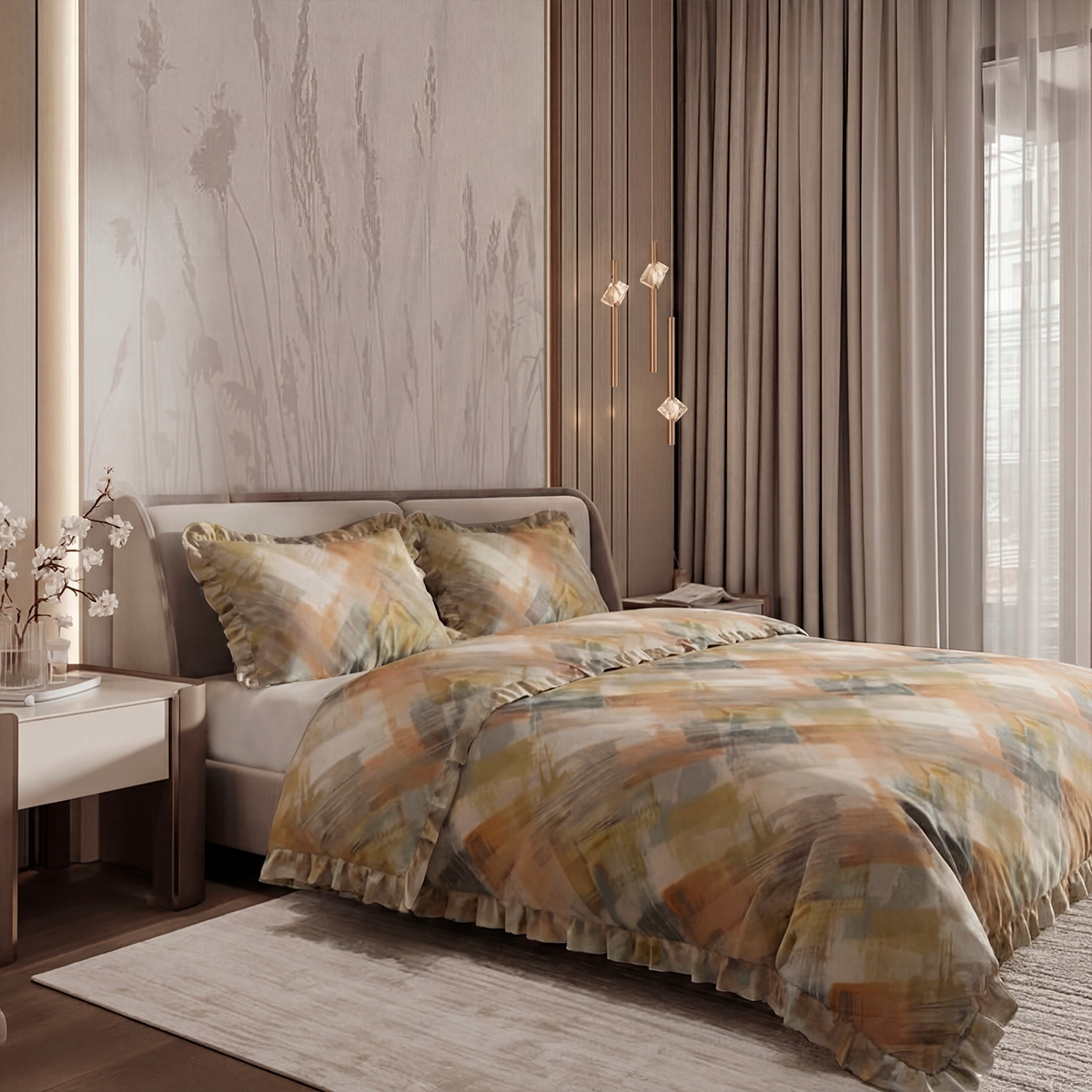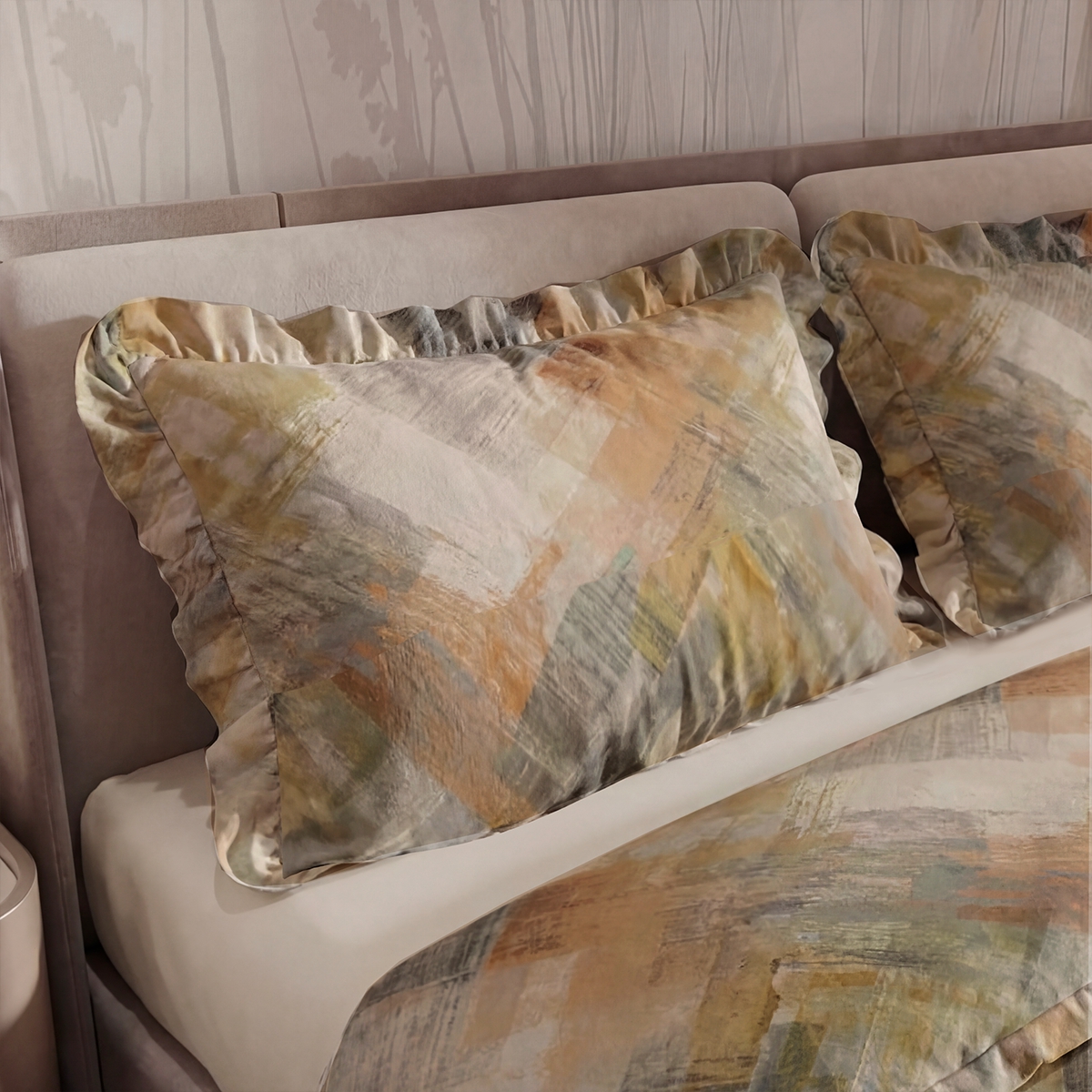 «Флоренсио»: Абстрактный принт, будто нарисованный широкой кистью. Сочетание оранжевого, серого, желто-зеленого и бежевого — это картина для вашей спальни. Энергичный, творческий, вдохновляющий на пробуждение.