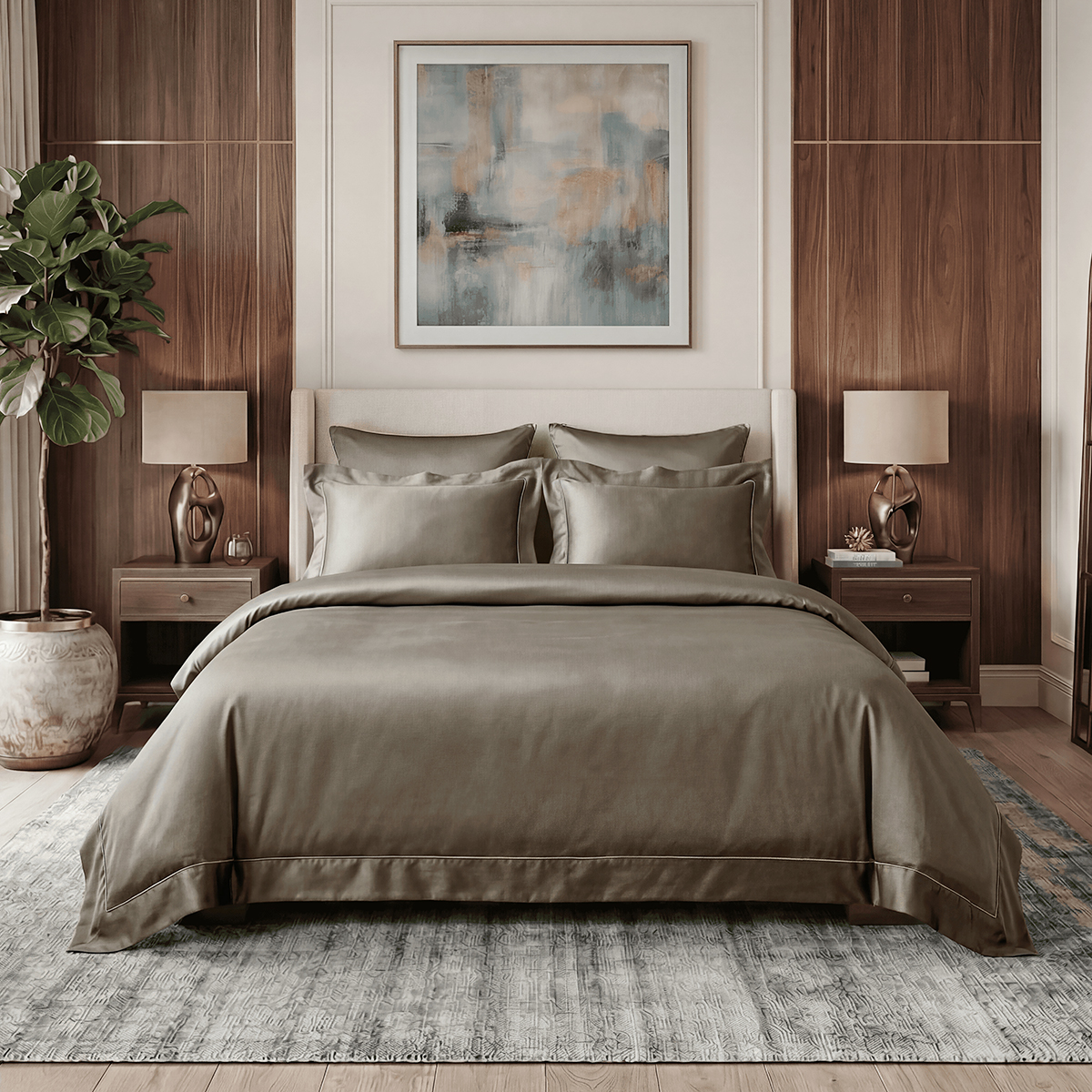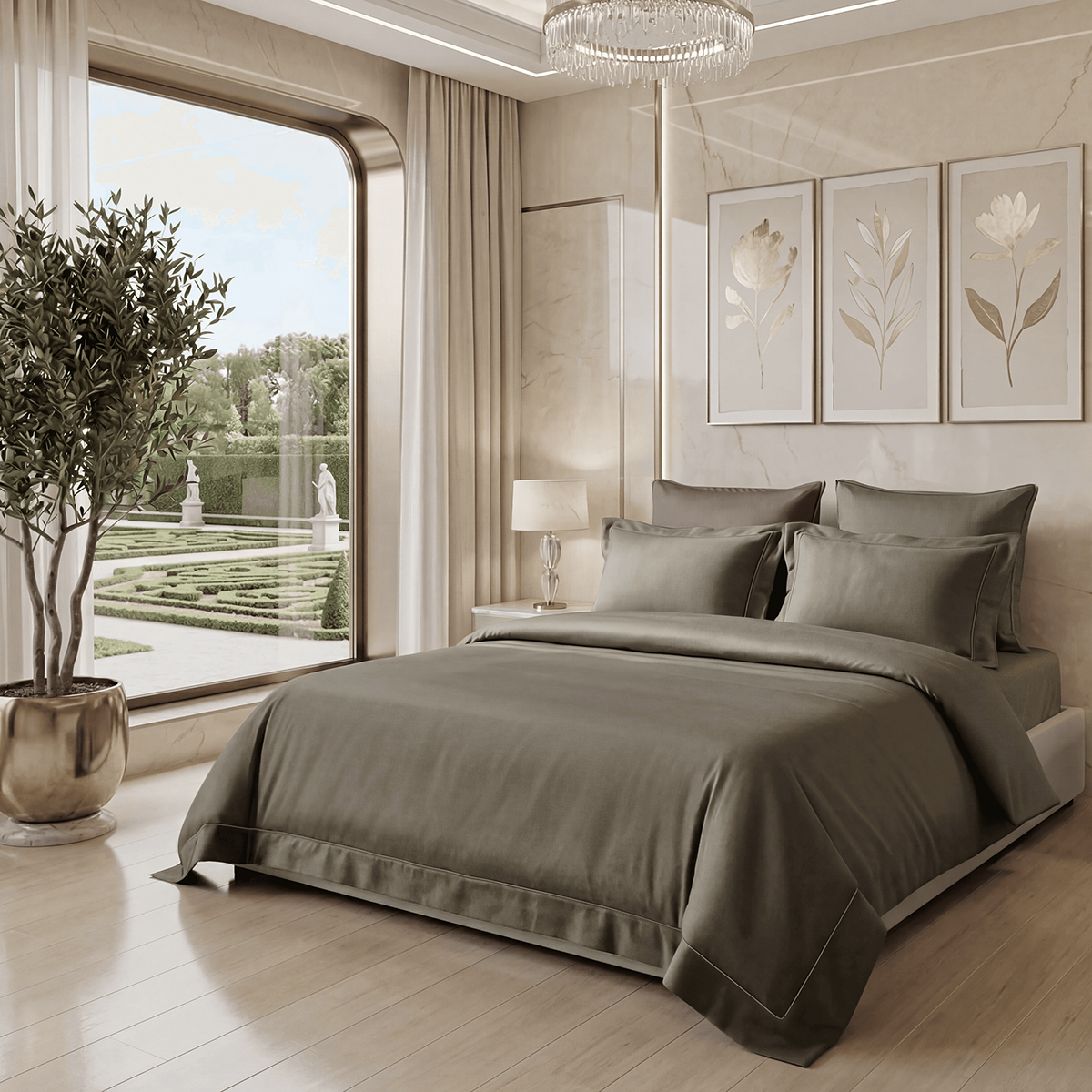 Редкий длинноволокнистый хлопок: нити прочнее и тоньше обычного, поэтому ткань не пиллингуется и не теряет форму. Сатиновое плетение создаёт живое сияние, как у шёлка, но с комфортом дышащего хлопка. Не электризуется, не скользит, приятен к телу. Выдерживает 500+ стирок без потери яркости и мягкости.